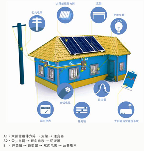 戶用分布式光伏系統主要由光伏組件、支架、逆變器及監控系統等組成,安裝在居民區屋頂,發電量自發自用、余電上網。